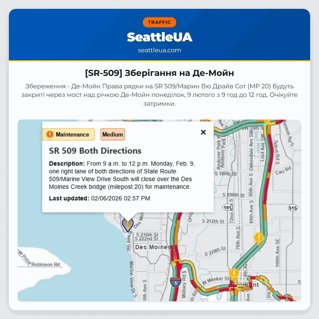 Права рядки на SR 509/Марин Вю Драйв Сот (MP 20) будуть закриті через мост над річкою Де-Мойн понеділок, 9 лютого з 9 год до 12 год. Очікуйте затримки.