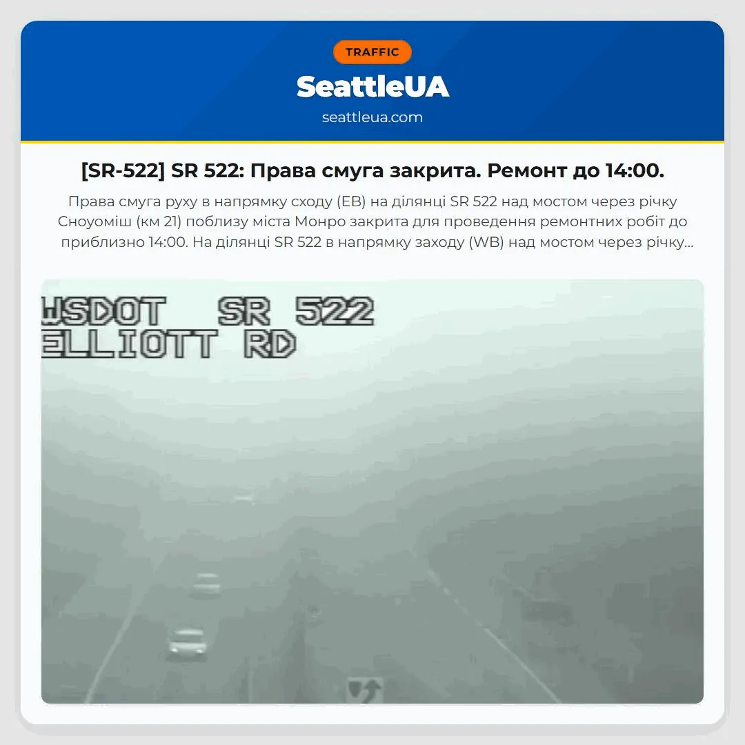 SR 522: Права смуга закрита. Ремонт до 14:00.