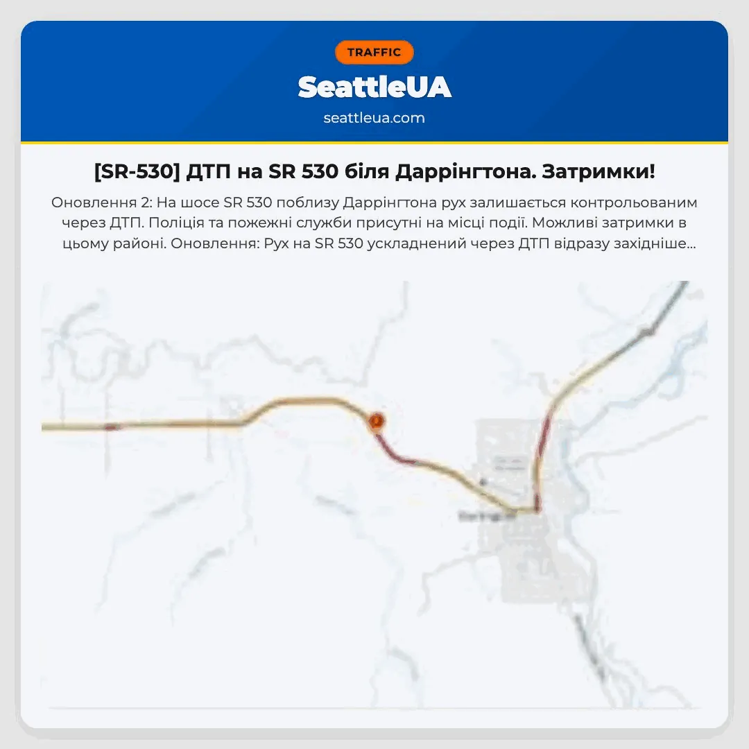 Оновлення 2: На шосе SR 530 поблизу Даррінгтона рух залишається контрольованим через ДТП. Поліція та пожежні служби присутні на місці події. Можливі затримки в цьому районі. Оновлення: Рух на SR 530 ускладнений через ДТП відразу західніше Даррінгтона. Поліція та рятувальники працюють на місці. Очікуються затримки.