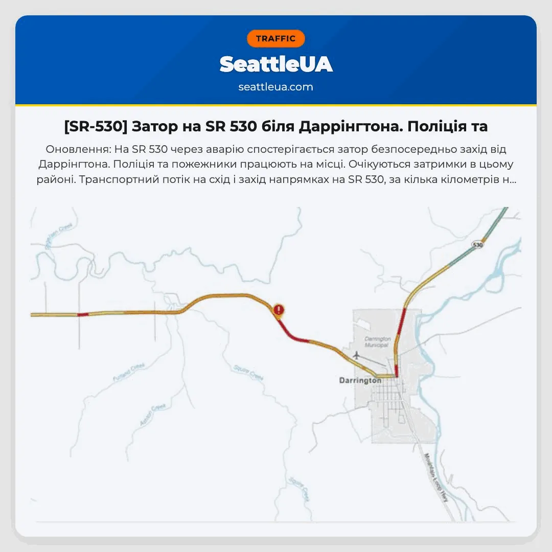 Оновлення: На SR 530 через аварію спостерігається затор безпосередньо захід від Даррінгтона. Поліція та пожежники працюють на місці. Очікуються затримки в цьому районі. Транспортний потік на схід і захід напрямках на SR 530, за кілька кілометрів на захід від Seeman St (MP 47), здійснюється чергово.
