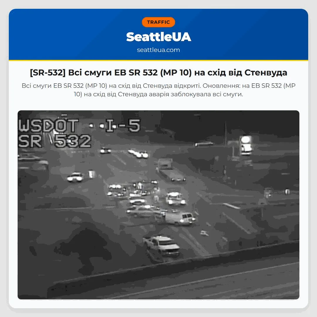 Всі смуги EB SR 532 (MP 10) на схід від Стенвуда відкриті. Оновлення: на EB SR 532 (MP 10) на схід від Стенвуда аварія заблокувала всі смуги.
