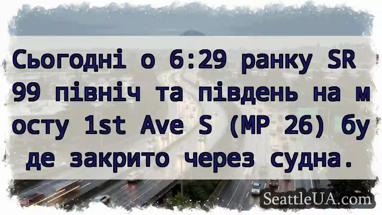 Сьогодні о 6:29 ранку SR 99 північ та південь на мосту 1st Ave S (MP 26) буде закрито через судна.