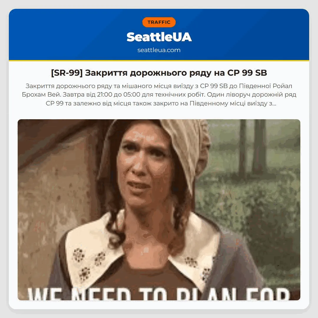 Закриття дорожнього ряду та мішаного місця виїзду з СР 99 SB до Південної Ройал Брохам Вей. Завтра від 21:00 до 05:00 для технічних робіт. Один ліворуч дорожній ряд СР 99 та залежно від місця також закрито на Південному місці виїзду з Александрівської Вулиці/Дарданеллівської Вулиці. Очікуйте затримки.
