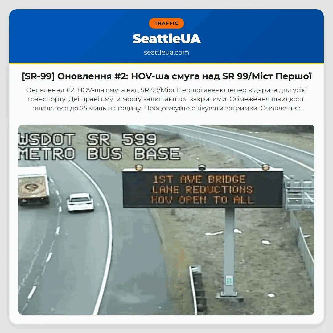 Оновлення #2: HOV-ша смуга над SR 99/Міст Першої авеню тепер відкрита для усієї транспорту. Дві праві смуги мосту залишаються закритими. Обмеження швидкості знизилося до 25 миль на годину. Продовжуйте очікувати затримки. Оновлення: Спостерігається 3,5-мільна затримка на північному напрямку SR 509 (напрямок Джорджтаун/СоДо) через зменшення смуг на SR 99/Міст Першої авеню. Продовжуйте очікувати затримки. Дві праві смуги мосту залишаються закритими.