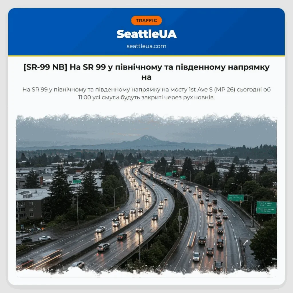 На SR 99 у північному та південному напрямку на мосту 1st Ave S (MP 26) сьогодні об 11:00 усі смуги будуть закриті через рух човнів.