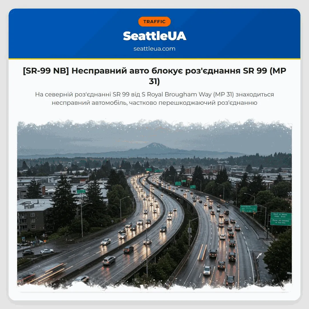 На северній роз’єднанні SR 99 від S Royal Brougham Way (MP 31) знаходиться несправний автомобіль, частково перешкоджаючий роз’єднанню