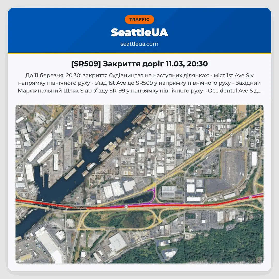 Трафік на SR509 у напрямку північного руху відводиться на Слов’явську вулицю. Обирайте альтернативні маршрути та дотримуйтеся обережності.